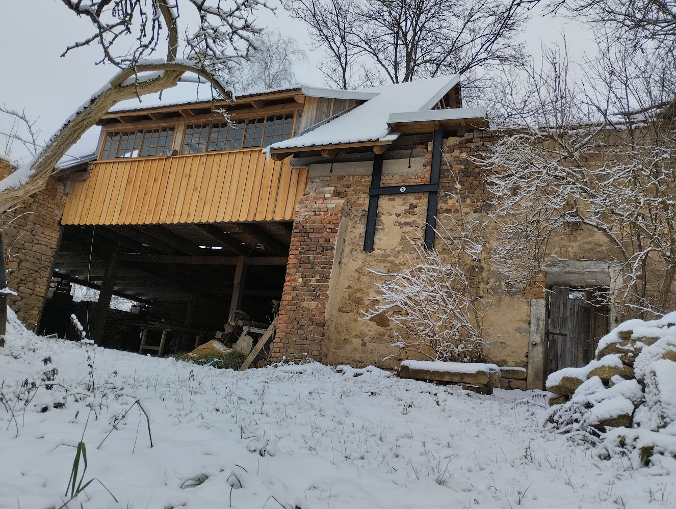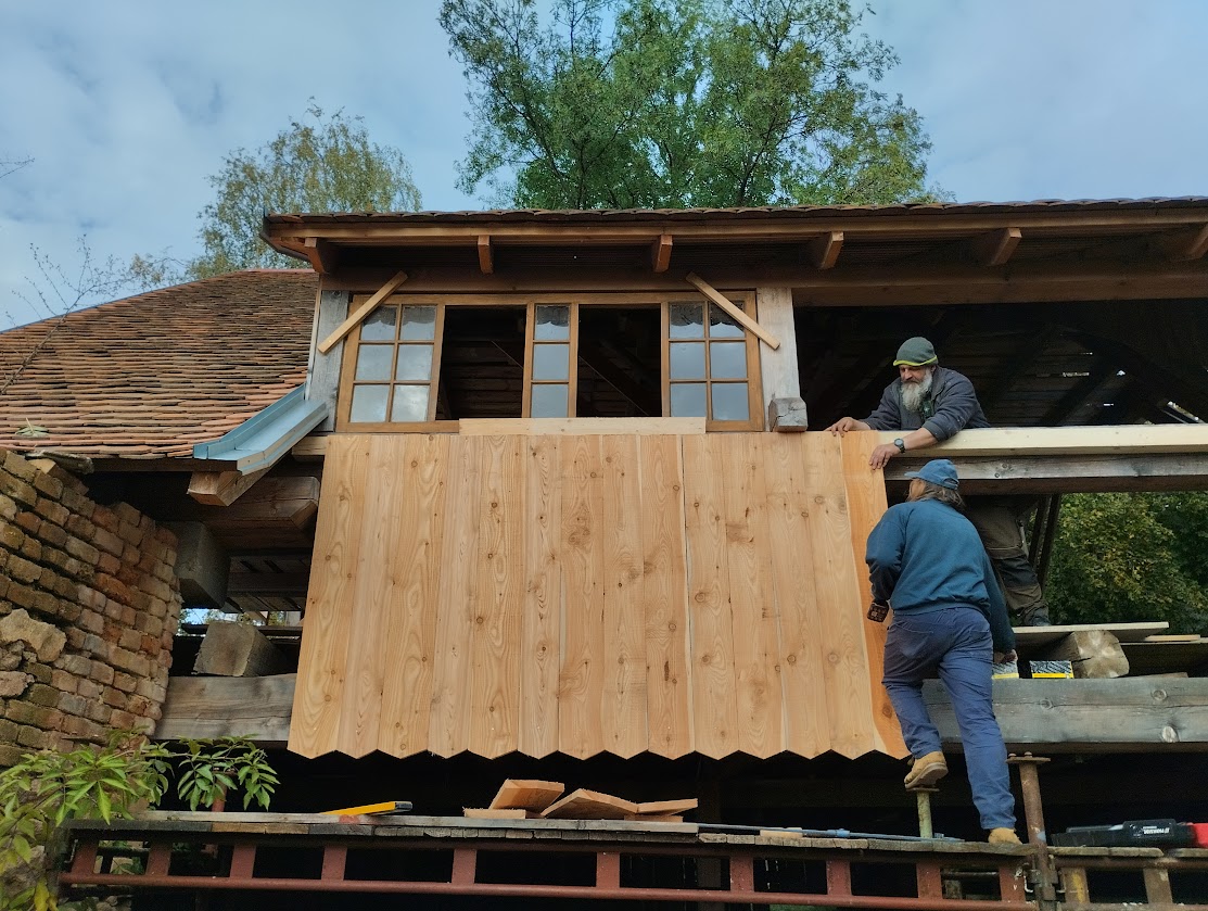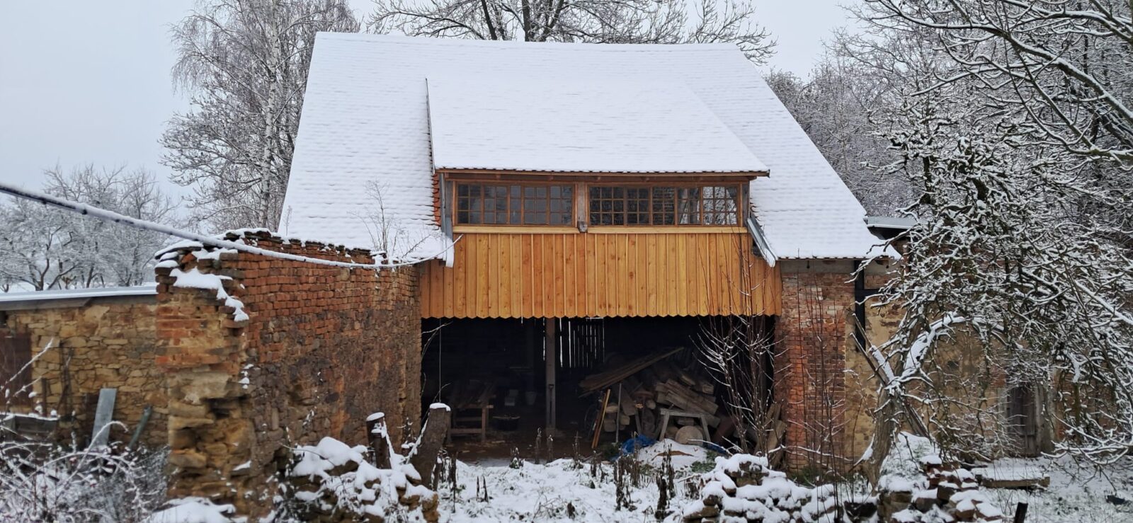 V prosinci se moc práce nenadělá, ale přesto Zbyněk s Honzou 2x přijeli a štít stodoly směrem na západní stranu získal novou tvář.