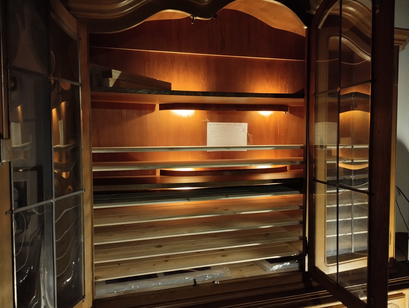 Pak se ale pustil do ještě geniálnějšího díla, ze kterýho jsem nadšená nejvíc ze všeho. Jak asi ví každý, kdo něco prodává a balí, tak logistika a uskladnění těch věcí je základ toho všeho. Nu a mně se obrázky na papíru válely na hromadě na sobě a nešlo je nijak jinak uskladnit. A hliníky jsem měla nastrkané ve skříni, kde neustále padaly a motaly se do sebe a nevešly se atd. S hliníky to ještě nějak šlo, protože jich bylo málo, ale ty papíry mi odesílání a řezání obrázků už dost ztížily. Zbyněk ovšem vymyslel naprosto jednoduchej a dokonce i pěknej systém, jak dovnitř té prosklené skříně dát poličky. Vzali jsme ze stodoly latě, on si nařezal takový palubky, a ty se vyskládaly na ty latě. Vznikly takové úzké poličky, zatím v půlce skříně, ale budou všude. A je to neuvěřitelný, ale vyjde to asi akorát přesně na počet obrázků, to nejde vymyslet, to bylo „shůry dáno“, jsem prohlásila. Mám z toho radost vskutku a nejvíc se těším, jak si tam budu obrázky skládat a vyrábět ten systém a popisovat cedulky.