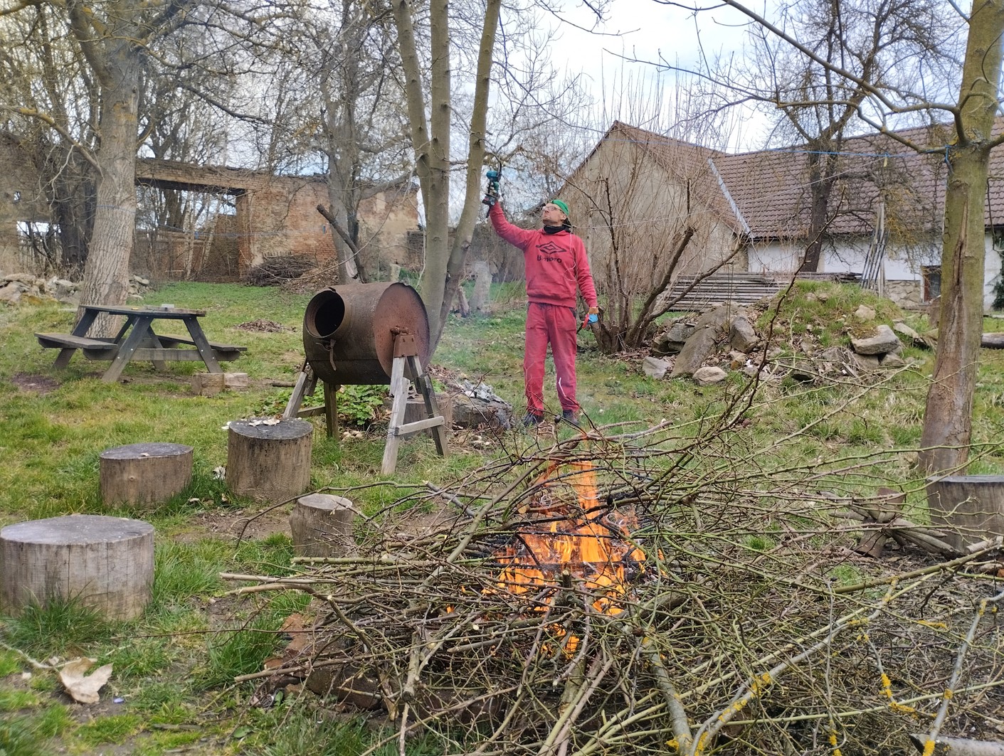Zapálili jsme oheň a Aleš na něj stále nosil trní. Byl to první letošní oheň. Já jsem hrabala na zahradě listí a celkem s tím popojela. Odvozila jsem nějaké hromádky, v jedné bylo i dřevo tlející, Aleš mi poradil, že to můžu použít jako mulč, tak jsem to nasypala k rybízům. Aleš se pak pustil do velkého rozhazování semínek, které přivezl, nějaké letničky, všude ryl rýčem a všude to všechno sypal. Jsem zvědavá, co z toho bude lézt. Aleš ostříhal taky ty nově zasazený stromky vzadu: švestku i hrušku. A na závěr odkopával hlínu od vrat. No krásně jsme s tím pohnuli prostě, a bylo to dobré odpoledne.