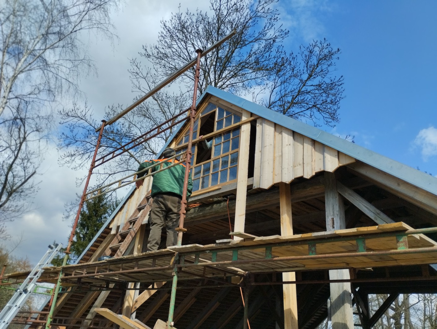 Přijeli Zbyněk s Honzou pokračovat na stodole. Přibíjeli prkna na levou část západního štítu. Další část může vysychat. Zůstal tam už jen otvor, kde bude veliká otevírací prosklená „brána“ a nad ní ještě velké okno. Světla tam půjde dost, jsme zjistili. Z toho mám radost. Říkala jsem, že tam pojedu v létě na dovolenou, „jezdím na dovolenou“ na různé části statku, dřív to bývalo na půdu, ale tam už je teď většinou někdo na tvůrčím pobytu, tak to radši přenechávám lidstvu. Kluci taky opravovali okapy, kopali díry pod nimi, i do čističky jsme koukali. Jedli v sednici svačinu a všelijak jsme povídali, jak to tak bývá.