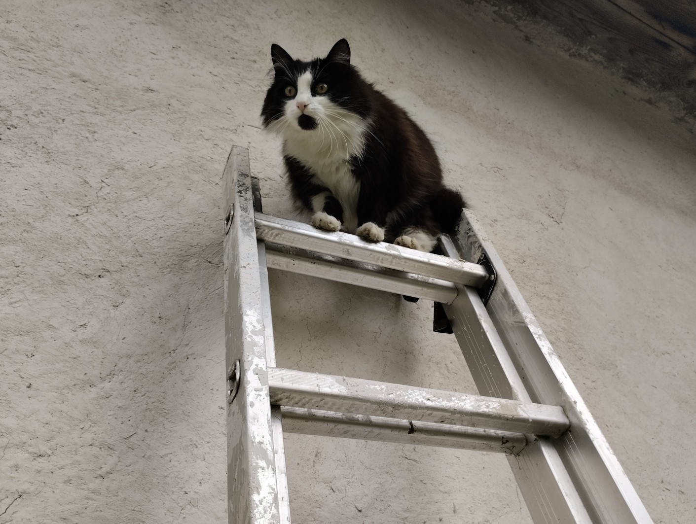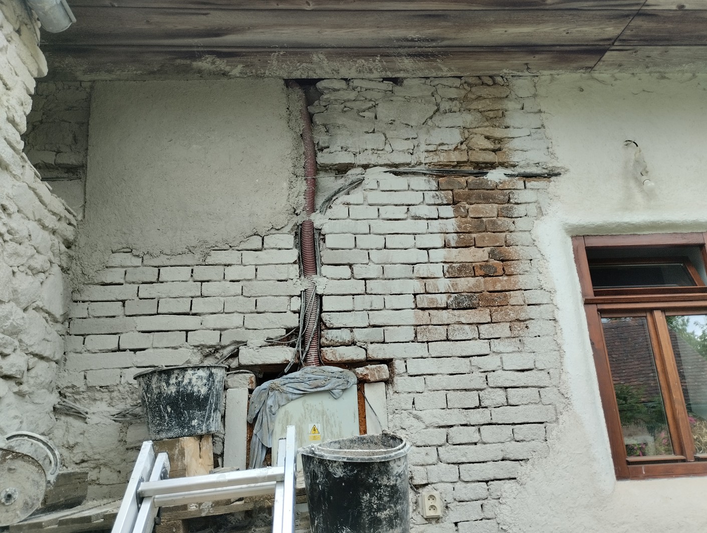 Omítka, den druhý. Začala jsem ve 14:15 a skončila kolem půl sedmé asi, měla jsem přestávku na kafe. Udělala jsem dvě míchačky, po té druhé jsem rozebrala lešení a dělala ze země spodek. Ale do neděle to nejspíš nestihnu, bude chybět kousek. Vycpávám díry kolem elektriky a taky kolem té skříně s pojistkami. Čistím zápraží a dveře pojistek. Frodík se mnou velmi pracoval, pořád ležel nahoře na lešení, šplhal i po žebříku, v srsti měl kousky vápna, ale vůbec mu to nevadilo. On mě pořád hlídá a na všem spolupracuje.