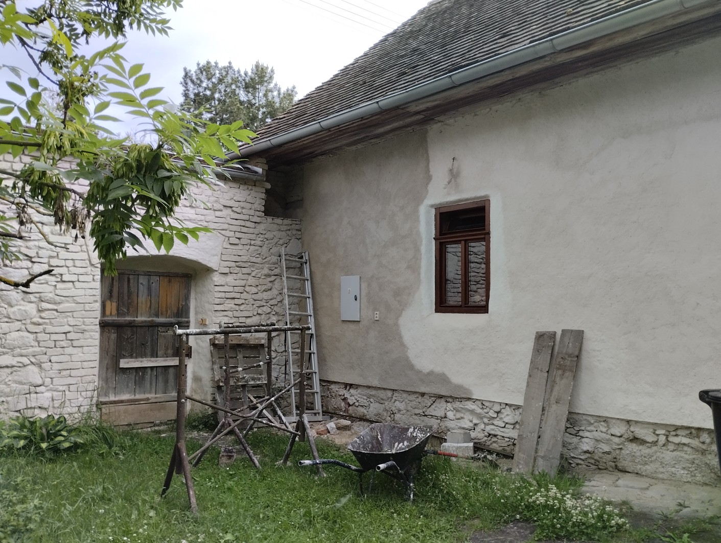 Tento týden jsem na sebe vyhlásila brigádu na omítku, páč se k tomu jinak nedonutím, než když to takhle vyhlásím. Ani jsem moc nechtěla, aby se mi někdo přihlásil. Je tady na pobytu Eva Schneiderová a ta mi případně pomůže. Začala jsem dnes jen tím, že si shledávám věci a zjišťuju, jestli mám cement a vápno. Mám, převezla jsem 4 pytle do stodoly, míchačka je tam a dávat na zápraží ji nechci. Lešení jsme postavili ve čtvrtek s Alžbětou a Davidem po józe.