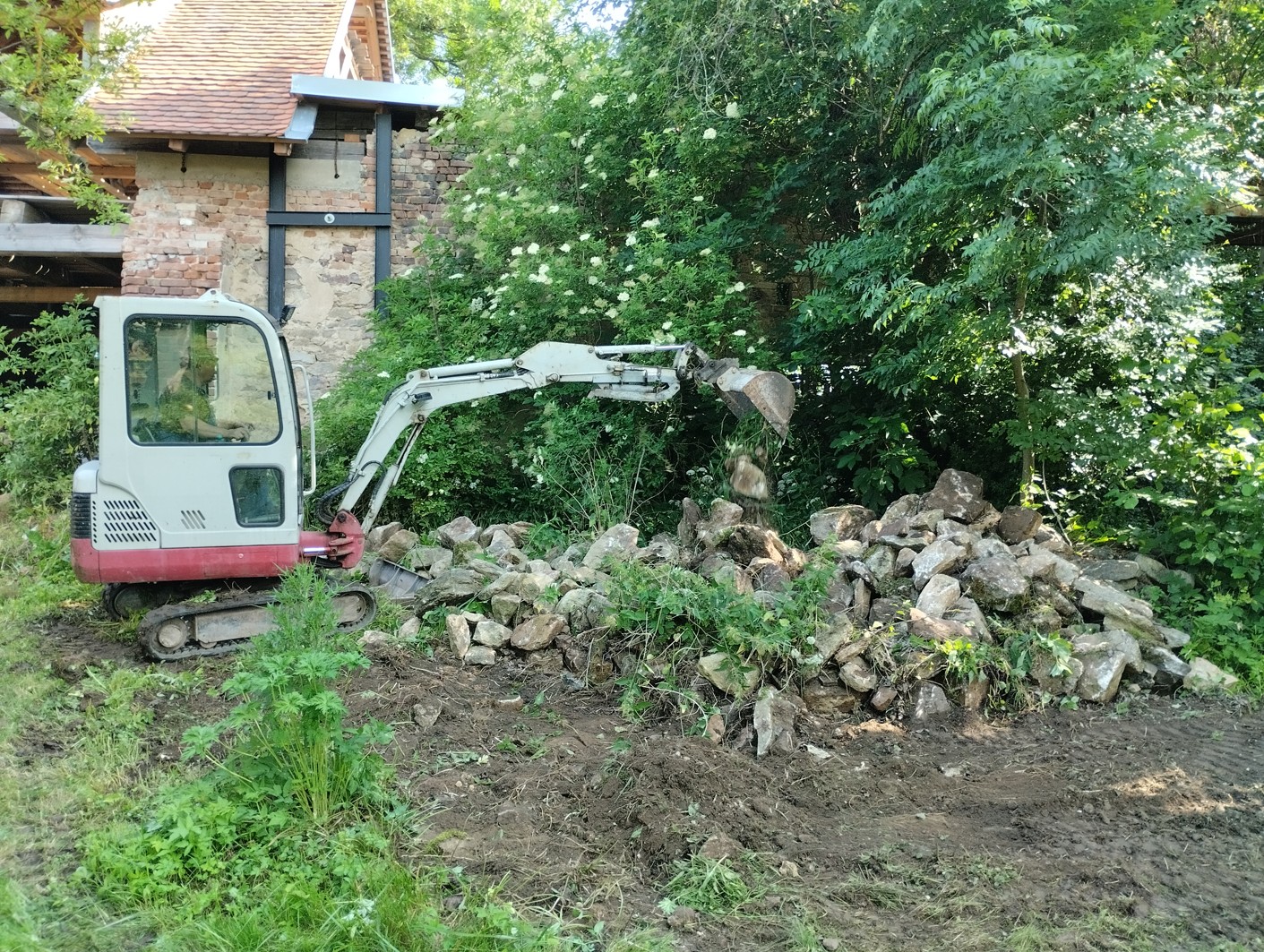 Dnes byl velký bagrovací den a prostor kolem stodoly doznal zásadní změny. Přijel bagrista Petr Láska a během asi sedmi hodin upravil úplně parádně prostor před stodolou a odvozil tu velkou hromadu hlíny ze stodoly. Nejdřív se pustil do té roztahané hromady šutrů, před spadlou částí stodoly. Je to pozůstatek jakési ohrady z kamení, kterou tam ještě budoval táta, ale muselo se to posunout, bylo to zarostlý totálně a v hrozným stavu. Vysvětlila jsem mu, že se mi líbí hromada kamení jen z holých kamenů, bez hlíny, tak tam navršil úplně parádní kamenný kopeček, mohylu až jakousi, dal tam i to kamenné korýtko a celé to dobře upravil. Chodila jsem se tam na to nadšeně dívat.