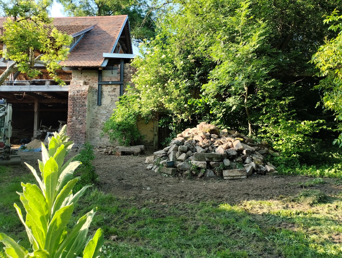 Udělal tam taky kamennou lavičku pod bezinkou. Upravila jsem trochu větve, takže je vidět i na ty starý vrátka do bývalého chlívku pro kozy. Odpoledne se pustil do té hromady hlíny ve stodole, vozil to do kouta vlevo před stodolou a vytvářel tam z toho úhledný kopec hlíny, jezdil po něm i bagrem. Všelijak jsme v průběhu dne hovořili, ukázala jsem mu půdu, vejminku a vysvětlila trochu, co tady dělám. Lidi o tom většinou vůbec netuší, články na webu nečtou. Jsem z té změny prostoru nadšená.